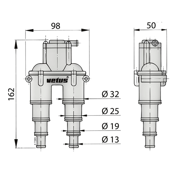 The stepped hose tails can be cut to enable the device to be connected to hoses of internal diameter 13mm (½"), 19mm (¾"), 25mm (1") or 32mm (1¼").