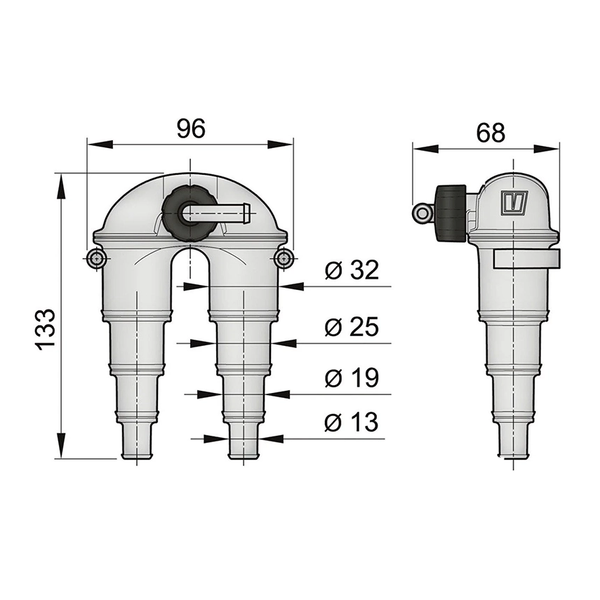 The stepped hose tails can be cut to enable the device to be connected to hoses of internal diameter 13mm (½"), 19mm (¾"), 25mm (1") or 32mm (1¼").