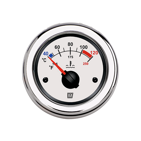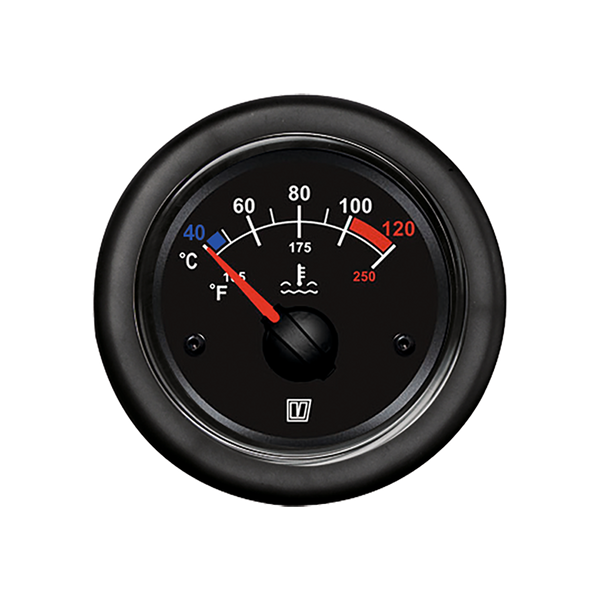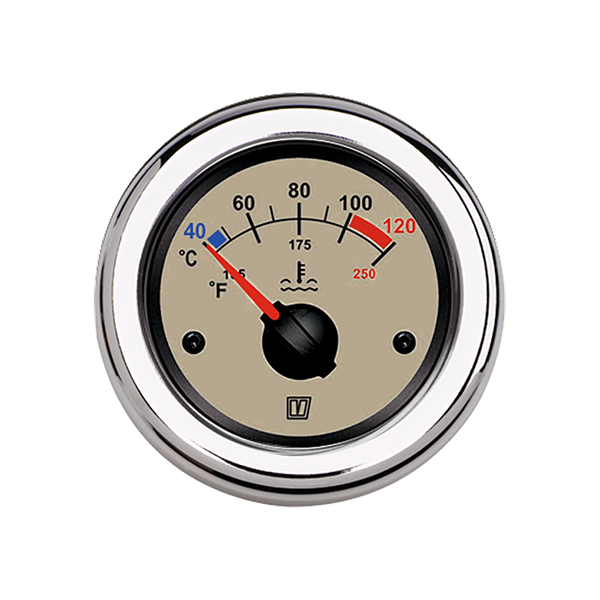 The gauge is calibrated 40-120°C and 105-250°F and is suitable for use with Vetus temperature sender TEMPSR120 (single pole) or TEMPSR122 (dual pole).