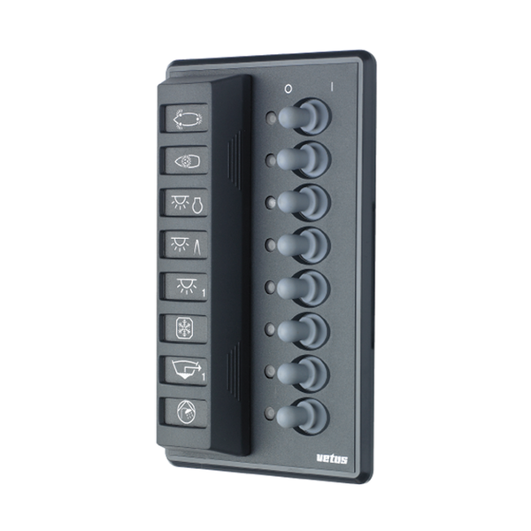 The Vetus P8FA is an 8-way switch panel 8-way, splash proof to IP64. It is suitable for 12v and 24v operation.