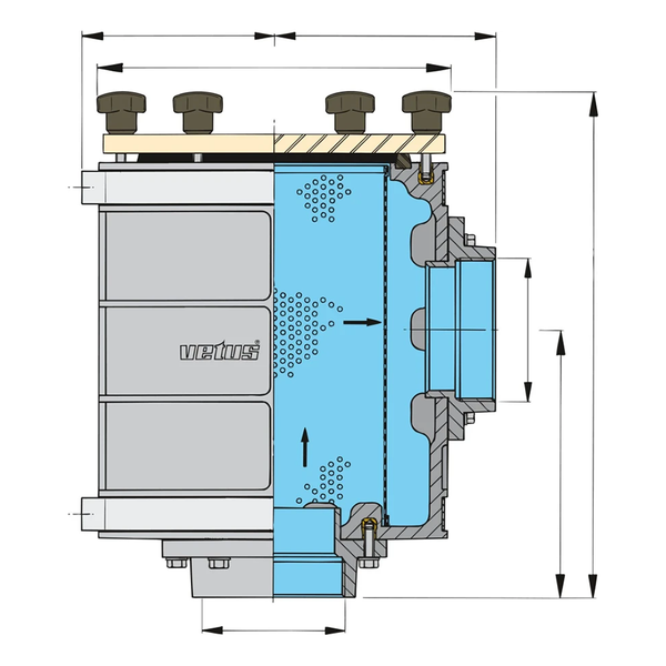 The Vetus Type 1900 cooling water strainer is suitable for larger engines, with a recommended flow rate up to 820 litres per minute.