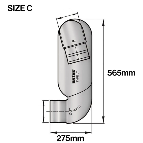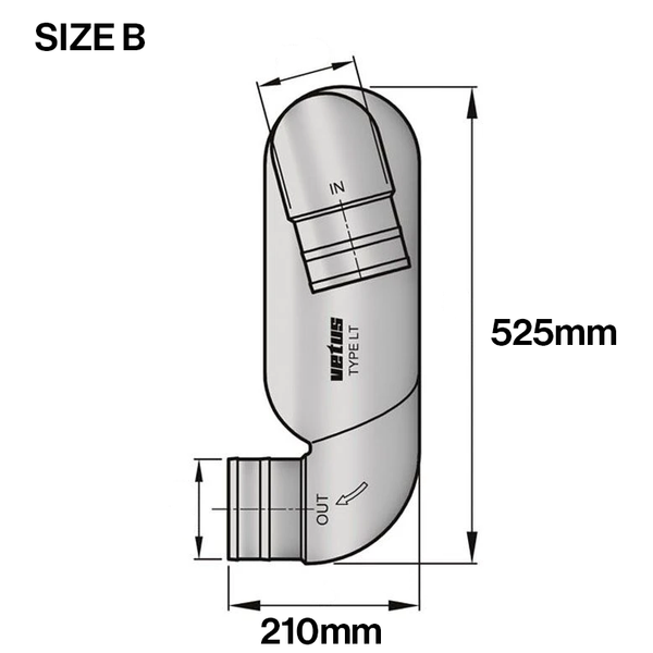 The outlet fits directly to a Vetus rubber transom exhaust connector. Supplied with stainless steel (AISI 316) mounting brackets.
