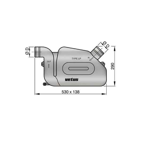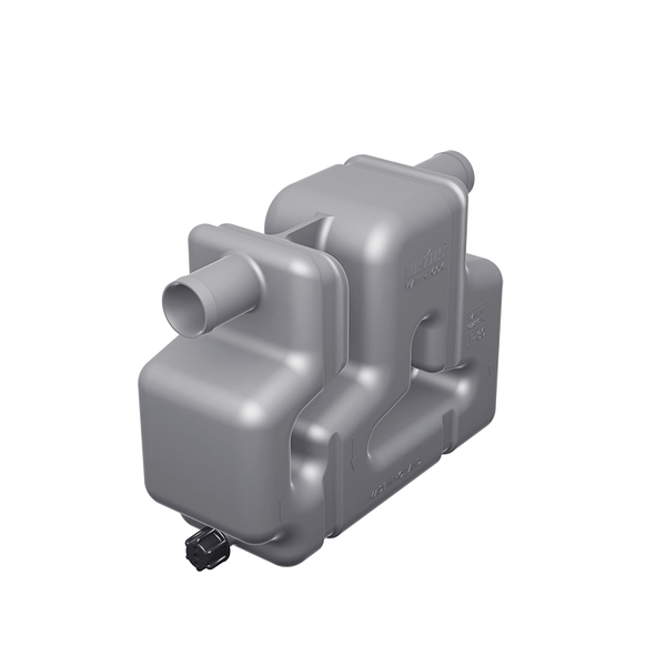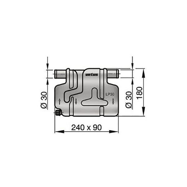 Standard waterlock with fixed inlet and outlet connectors. The waterlock for 30mm exhaust hose has capacity of 2.3 litres; the waterlock for 50mm, 60mm, 75mm & 90mm has capacity of 10.5 litres.