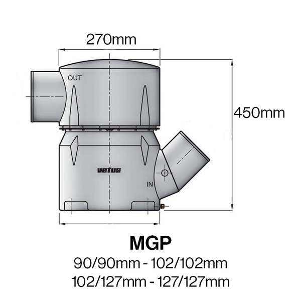 The MG series of waterlocks are designed for modern high-performance boats with large engines which leave little space to spare in the engine room. The outlet connection at the top can rotate through 360° and the inlet connection is at an angle of 45° upwards