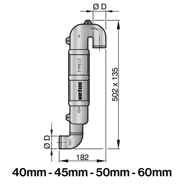 The outlet fits directly to a Vetus rubber transom exhaust connector. Supplied with stainless steel (AISI 316) mounting brackets.